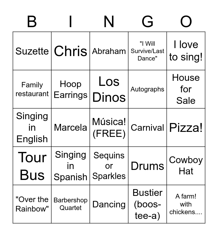 This bingo card has a free space and 24 words: Singing in Spanish, Barbershop Quartet, Los Dinos, "Over the Rainbow", I love to sing!, Suzette, Family restaurant, Chris, Carnival, Sequins or Sparkles, Autographs, Singing in English, Drums, Cowboy Hat, Hoop Earrings, Bustier (boos-tee-a), Pizza!, Abraham, House for Sale, Marcela, A farm! with chickens...., Tour Bus, "I Will Survive/Last Dance" and Dancing.