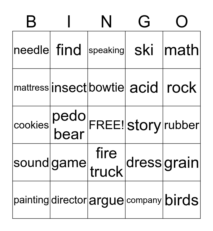 This bingo card has a free space and 24 words: game, director, bowtie, painting, math, needle, mattress, find, story, fire truck, acid, cookies, dress, grain, insect, company, rubber, speaking, rock, pedo bear, birds, sound, ski and argue.