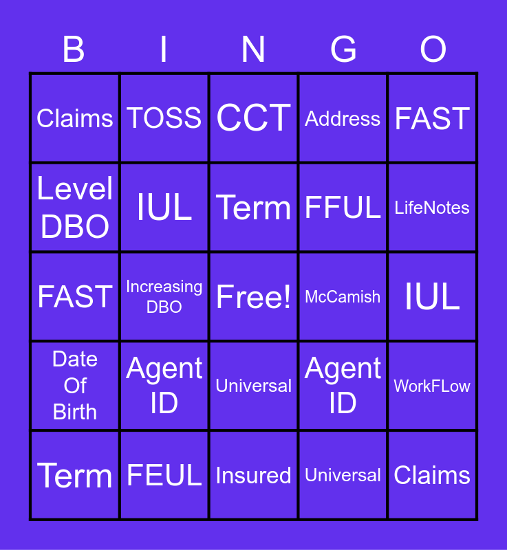 This bingo card has a free space and 63 words: CSA, LifeComm, LifeNet, WorkFLow, Universal, Archive, TOSS, LifeNotes, Term, Whole, Universal, VUL, IUL, FAST, McCamish, Level DBO, Increasing DBO, Claims, FEUL, FFUL, Agent ID, Date Of Birth, Address, Policy Owner, Insured, Payor, Beneficiaries, SSN, CSA, LifeComm, LifeNet, WorkFLow, Archive, TOSS, LifeNotes, Term, Whole, Universal, VUL, IUL, FAST, McCamish, Level DBO, Increasing DBO, Claims, FEUL, FFUL, Agent ID, Date Of Birth, Address, Policy Owner, Insured, Payor, Beneficiaries, AST, CCT, PTO, PROPS, Research, FNWL, Benevity, Benefits and FGBWL.