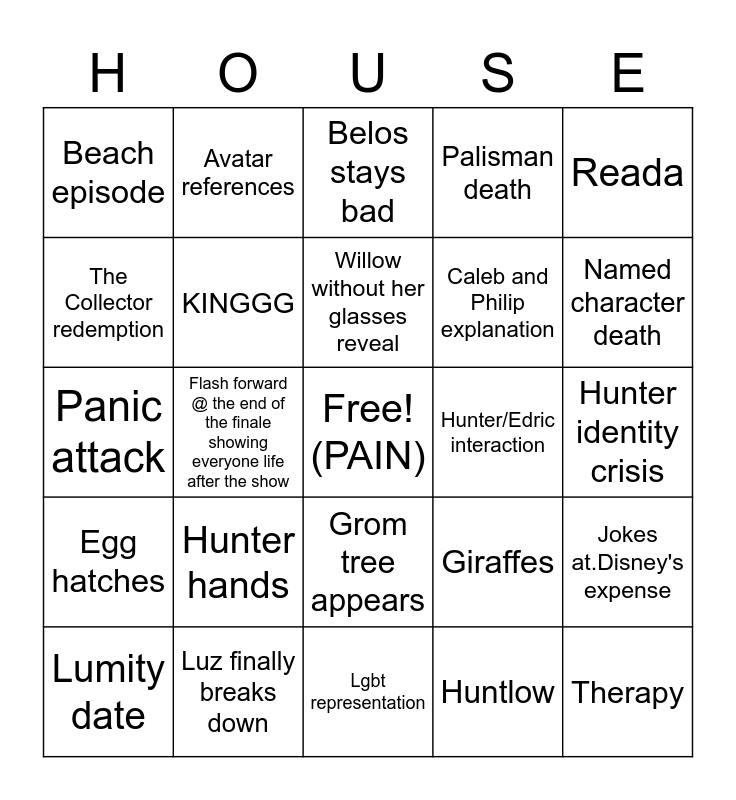 This bingo card has a free space and 24 words: Hunter hands, Luz finally breaks down, Willow without her glasses reveal, Lumity date, Reada, Beach episode, The Collector redemption, Avatar references, Hunter/Edric interaction, Grom tree appears, Caleb and Philip explanation, Panic attack, Giraffes, Jokes at.Disney's expense, KINGGG, Huntlow, Hunter identity crisis, Belos stays bad, Named character death, Flash forward @ the end of the finale showing everyone life after the show, Therapy, Egg hatches, Palisman death and Lgbt representation.