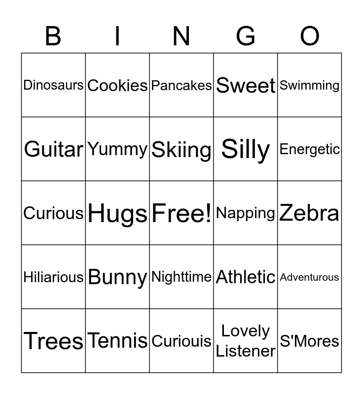 This bingo card has a free space and 24 words: Bunny, Tennis, Skiing, Trees, Swimming, Dinosaurs, Guitar, Cookies, Napping, Nighttime, Silly, Curious, Athletic, Adventurous, Yummy, Lovely Listener, Zebra, Pancakes, Energetic, Hugs, S'Mores, Hiliarious, Sweet and Curiouis.