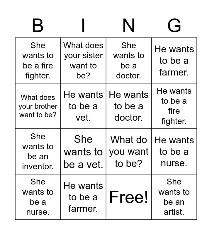 This bingo card has 17 words: Free!, She wants to be a nurse., She wants to be a doctor., She wants to be a fire fighter., She wants to be a vet., He wants to be a farmer., He wants to be a nurse., He wants to be a doctor., He wants to be a fire fighter., He wants to be a vet., He wants to be a farmer., What do you want to be?, What does your brother want to be?, What does your sister want to be?, She wants to be an inventor., He wants to be an inventor. and She wants to be an artist..