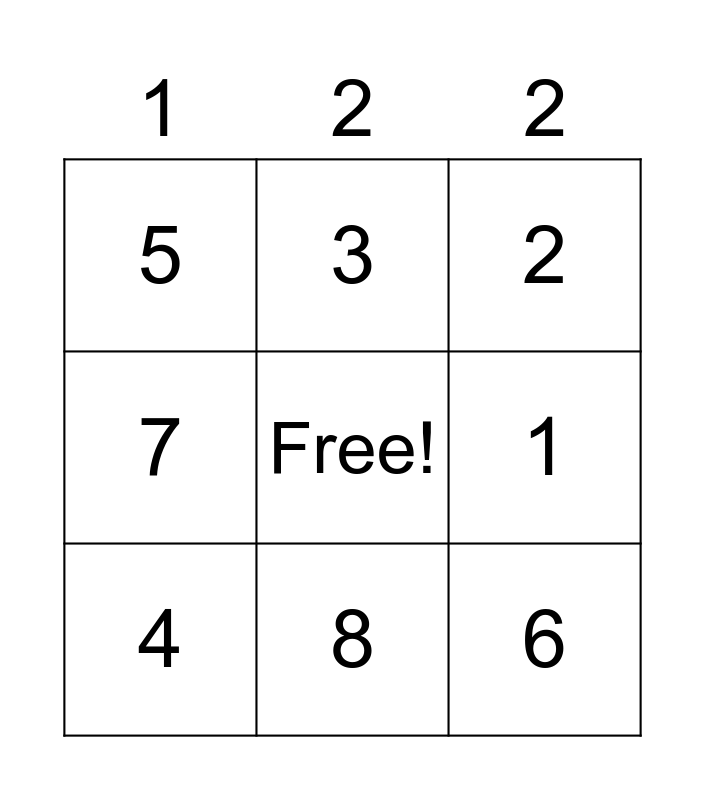 This bingo card has a free space and 8 words: 1, 2, 3, 4, 5, 6, 7 and 8.