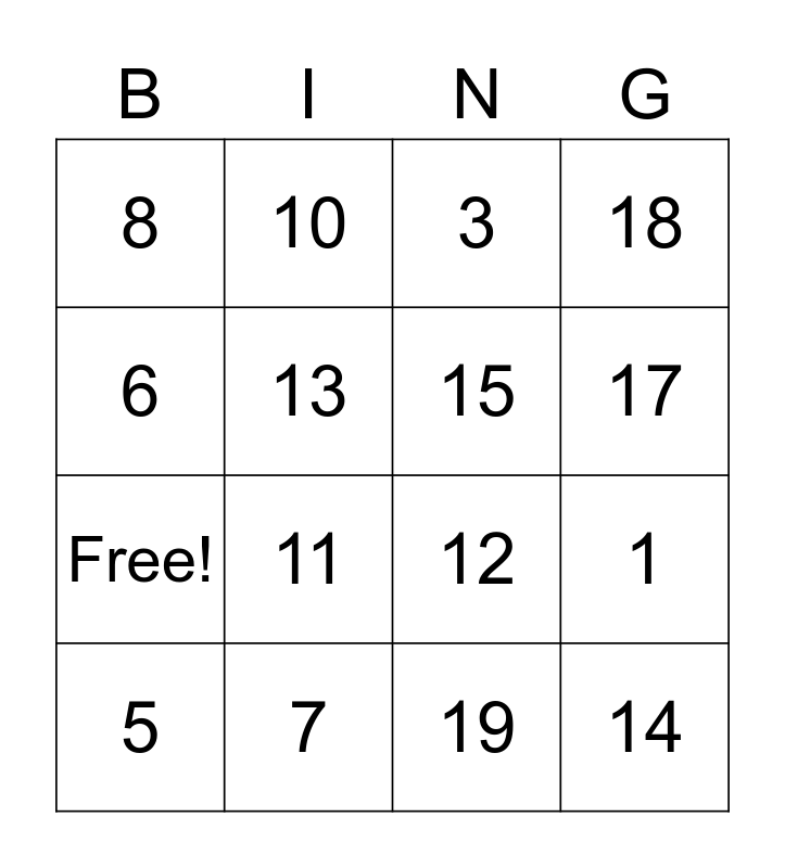 This bingo card has 20 words: 1, 2, 3, 4, 5, 6, 7, 8, Free!, 10, 11, 12, 13, 14, 15, 16, 17, 18, 19 and 20.