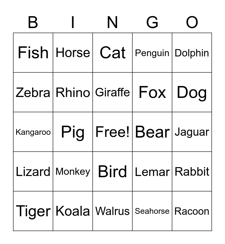 This bingo card has a free space and 24 words: Tiger, Monkey, Giraffe, Seahorse, Dolphin, Fish, Horse, Cat, Bear, Jaguar, Kangaroo, Rhino, Lemar, Rabbit, Zebra, Koala, Walrus, Penguin, Dog, Lizard, Pig, Bird, Fox and Racoon.