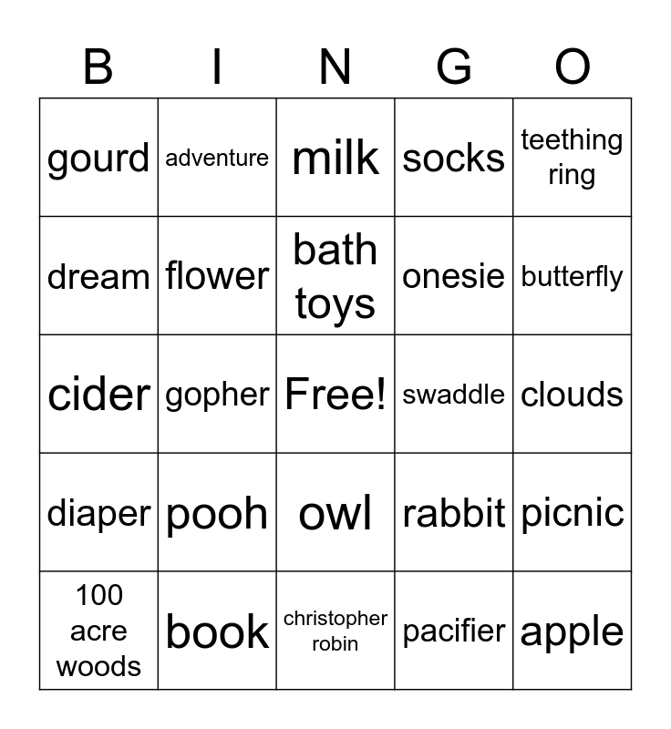 This bingo card has a free space and 58 words: explore, book, tree, diaper, pacifier, blanket, flower, bottle, onesie, baby oil, socks, brush, crib, boy, pumpkin, gourd, apple, teething ring, wipes, bath toys, swaddle, milk, 100 acre woods, picnic, lumpy, clouds, forest, wisdom, butterfly, bib, baby powder, rumbly, stroller, bassinet, high chair, smackeral, rattle, gopher, cider, cocoa, pooh, piglet, rabbit, eeyore, kanga, roo, tigger, owl, christopher robin, hunny, woozle, leaf, bee hive, friendship, adventure, balloon, dream and garden.