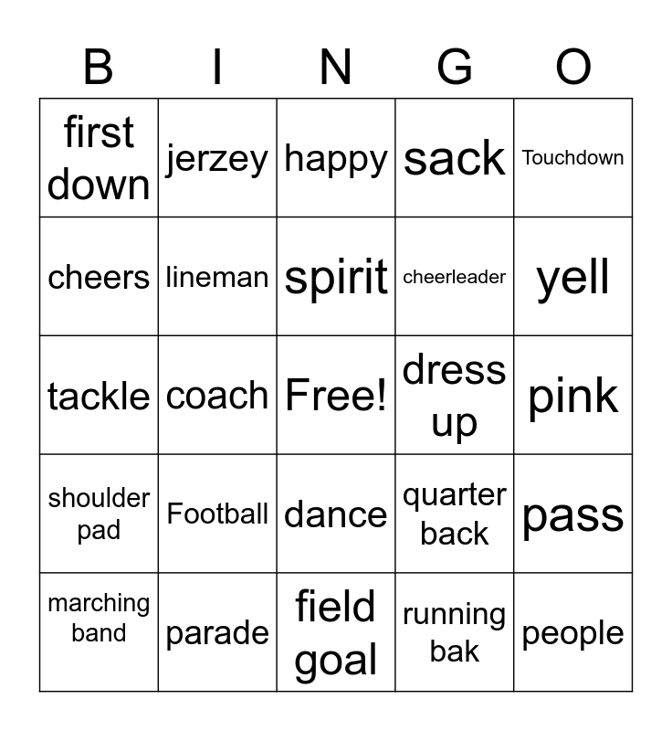 This bingo card has a free space and 24 words: Football, parade, spirit, marching band, Touchdown, first down, cheers, jerzey, dress up, dance, cheerleader, tackle, quarter back, pass, lineman, running bak, pink, happy, yell, coach, people, shoulder pad, sack and field goal.
