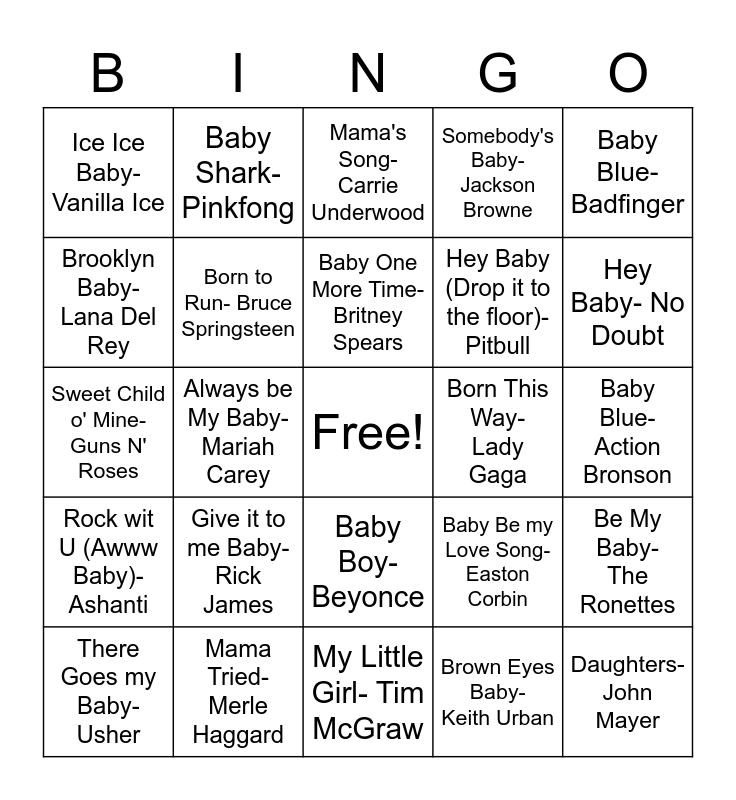 This bingo card has a free space and 67 words: Baby Justin Bieber, Baby I need your loving- Four Tops, Hey Baby- Bruce Channel, Be My Baby- The Ronettes, Baby Love- The Supremes, Cry Baby- Megan Thee Stallion, Baby Shark- Pinkfong, Baby got Back- Sir mix-A-Lot, Baby One More Time- Britney Spears, Baby Come Back- Player, Baby Boy- Beyonce, Baby, I love Your Way- Big Mountain, Baby Blue- Action Bronson, Baby Blue- Badfinger, INDUSTRY BABY- Lil Nas X, Brooklyn Baby- Lana Del Rey, Always be My Baby- Mariah Carey, Ice Ice Baby- Vanilla Ice, When she says Baby- Jason Aldean, Hey Baby (Drop it to the floor)- Pitbull, Give it to me Baby- Rick James, Rock wit U (Awww Baby)- Ashanti, Somebody's Baby- Jackson Browne, Brown Eyes Baby- Keith Urban, Don't worry Baby- The Beach Boys, Be my Baby Tonight- John Michael Mongomery, baby Come Back- Player, Baby-Baby-Baby- TLC, Hey Baby- No Doubt, In my Daughter's Eyes=- Martina McBride, Daughters- John Mayer, My Little Girl Tim McGraw, Come on Over Baby- Christina Aguilera, Someone Else Calling You Baby- Luke Bryan, Baby Girl- Sugarland, There Goes my Baby- Usher, Baby Blue- George Strait, Baby Be my Love Song- Easton Corbin, Sweet Child o' Mine- Guns N' Roses, Baby I'm a Star-Prince, Born to be Wild- Steppenwolf, Born to Run- Bruce Springsteen, Born This Way- Lady Gaga, Born in the USA- Bruce Springsteen, Born Again- Tyler Childers, Born Free- Kid Rock, Born to Fly- Sara Evans, Mama Tried- Merle Haggard, Mamma Mia- ABBA, Mamas Don't Let Your Babies Grow Up to Be Cowboys- Waylon Jennings, Mama's Song- Carrie Underwood, Mama Said Knock you Down- LL Cool J, God, Your Mama, And Me- Florida Georgia Line, Mama's Broken Heart- Miranda Lambert, Daddy Lessons- Beyonce, My Little Girl- Tim McGraw, Daddy's Money- Ricochet, Father of Mine- Everclear, My Old Man, Zach Brown Band, Kids- MGMT, Kids in America-Kim Wilde, American Kids- Kenny Chesney, You're Gonna go Far Kid- The Offsprings, Mamma Song- Cody Jinks, Mama- My Chemical Romance, Mama, I'm Coming Home- Ozzy Osbourne and MAMACITA- Black Eyed Peas.