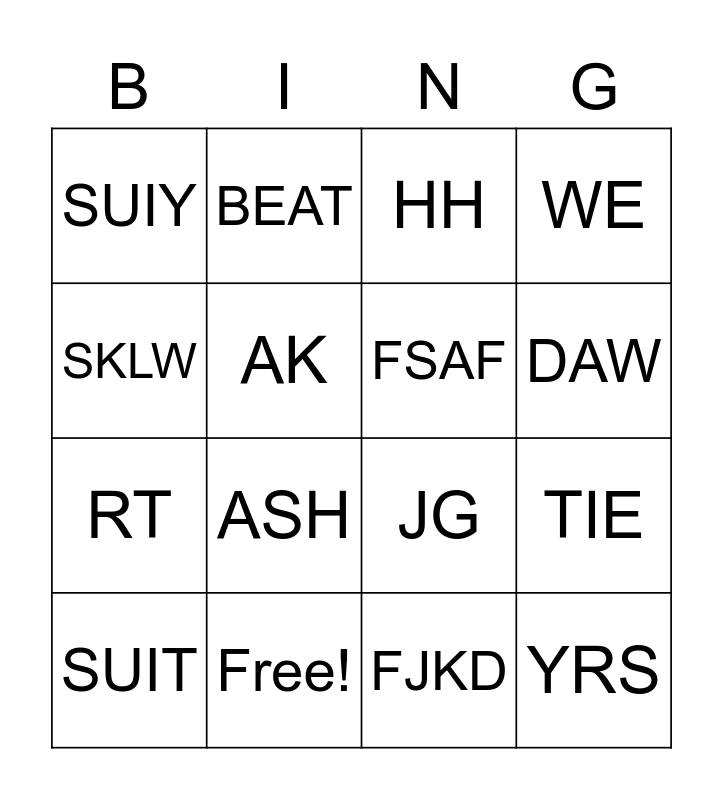 This bingo card has 28 words: RT, TEST, RT, TIGER, AK, HH, BEAT, YRS, Free!, TEST A, JG, WE, KR, RG, ASH, NID, THER, FSAF, DAW, WER, SUIY, TES, SUIT, TIE, FJKD, SKL, SKLW and SD.