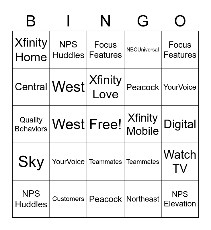 This bingo card has a free space and 66 words: Xfinity, xFi, Voice Remote, Watch TV, NPS Elevation, eNPS Shout Out, NPS Huddles, NPS Callbacks, Xfinity Love, Customer Service Week, Teammates, Customers, Digital, Focus Features, Northeast, Central, West, Xfinity Home, Xchange, Peacock, YourVoice, Sky, NBCUniversal, Saturday Night Live, Xfinity, xFi, Voice Remote, Watch TV, NPS Elevation, eNPS Shout Out, NPS Huddles, NPS Callbacks, Xfinity Love, Customer Service Week, Teammates, Customers, Digital, Quality Behaviors, Northeast, Central, West, Xfinity Home, Xfinity Mobile, Flex, My Account, Festive Fleet, YourVoice, NBCUniversal, Sky, Cable, Innovation, Entertainment, Media, 1963, The Tonight Show, Saturday Night Live, Team UP, Comcast Business, Focus Features, Peacock, Gigabit, Internet Essentials, Integrity, Accessibility, Reliability and Xchange.