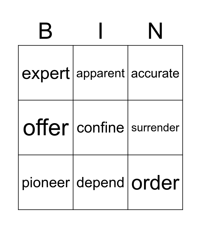 This bingo card has 12 words: require, order, confine, surrender, apparent, accurate, depend, ideal, expert, offer, pioneer and struggle.