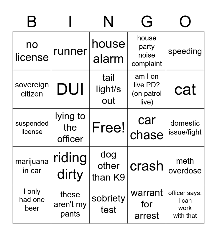 This bingo card has a free space and 24 words: riding dirty, these aren't my pants, tail light/s out, I only had one beer, speeding, no license, sovereign citizen, runner, car chase, dog other than K9, am I on live PD? (on patrol live), suspended license, crash, meth overdose, DUI, warrant for arrest, domestic issue/fight, house alarm, cat, lying to the officer, officer says: I can work with that, marijuana in car, house party noise complaint and sobriety test.