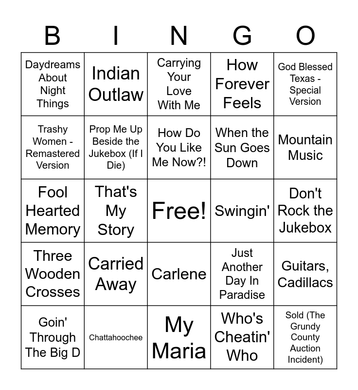 This bingo card has a free space and 82 words: Check Yes Or No, Red Dirt Road, Carrying Your Love With Me, Life's a Dance, Some Girls Do, I'm Gonna Be Somebody, Wink, The Shake, Be My Baby Tonight, Watermelon Crawl, T-R-O-U-B-L-E, Bubba Shot The Jukebox, Prop Me Up Beside the Jukebox (If I Die), Swingin', Tight Fittin' Jeans, Daydreams About Night Things, Goin' Through The Big D, Trashy Women - Remastered Version, Queen Of My Double Wide Trailer, Dust On The Bottle, Redneck Yacht Club, When the Sun Goes Down, Sold (The Grundy County Auction Incident), God Blessed Texas - Special Version, That's My Story, Third Rock from the Sun, The Race Is On, Baby Likes To Rock It, Daddy's Money, My Kind of Girl, Carried Away, Ocean Front Property, Fool Hearted Memory, Where The Green Grass Grows, She's Got It All, My Maria, Brand New Man, Fast as You, Mountain Music, Dixieland Delight - Single Edit, Amarillo By Morning, How Forever Feels, Young, Mammas Don't Let Your Babies Grow up to Be Cowboys, Brokenheartsville, Indian Outlaw, Real Good Man, How Do You Like Me Now?!, 19 Somethin' - Greatest Hits Version, Mr. Mom, Paint Me a Birmingham, Don't Rock the Jukebox, Chattahoochee, It's Five O'Clock Somewhere, Killin' Time, Brown Eyed Girl, Cheeseburger In Paradise, Two Pina Coladas, Friends in Low Places, Just Another Day In Paradise, The Good Stuff, Neon Moon, Three Wooden Crosses, Heads Carolina, Tails California, XXX's And OOO's (An American Girl), Good Directions, I Can Love You Like That, I Swear, Cowboys Like Us, Drive (For Daddy Gene), Tall, Tall Trees, Mercury Blues, Carlene, Who's Cheatin' Who, Some Beach, Thinkin' Problem, Almost Home, Paint Me A Birmingham, Troubadour, If You're Gonna Play in Texas (You Gotta Have a Fiddle in the Band), Guitars, Cadillacs and Boot Scootin' Boogie.