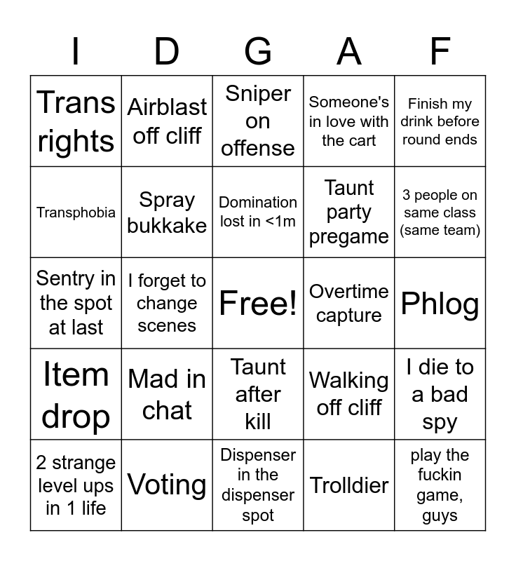 This bingo card has a free space and 24 words: Mad in chat, Voting, Domination lost in <1m, 2 strange level ups in 1 life, Finish my drink before round ends, Trans rights, Transphobia, Airblast off cliff, Overtime capture, Taunt after kill, Taunt party pregame, Sentry in the spot at last, Walking off cliff, I die to a bad spy, Spray bukkake, Trolldier, Phlog, Sniper on offense, 3 people on same class (same team), I forget to change scenes, play the fuckin game, guys, Item drop, Someone's in love with the cart and Dispenser in the dispenser spot.