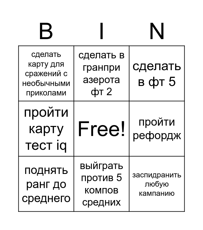 This bingo card has a free space and 8 words: пройти рефордж, сделать в фт 5, сделать в гранпри азерота фт 2, поднять ранг до среднего, сделать карту для сражений с необычными приколами, заспидранить любую кампанию, пройти карту тест iq and выйграть против 5 компов средних.