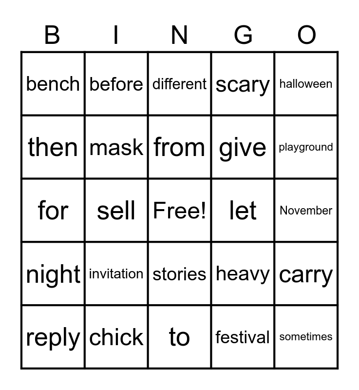 This bingo card has a free space and 25 words: invitation, to, from, reply, halloween, bench, then, before, let, stories, give, for, heavy, carry, mask, neighbour, November, different, playground, sell, sometimes, chick, night, scary and festival.