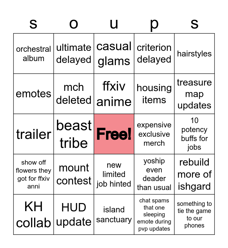 This bingo card has a free space and 24 words: mount contest, HUD update, ffxiv anime, KH collab, hairstyles, orchestral album, emotes, ultimate delayed, expensive exclusive merch, new limited job hinted, housing items, trailer, yoship even deader than usual, rebuild more of ishgard, mch deleted, chat spams that one sleeping emote during pvp updates, 10 potency buffs for jobs, casual glams, treasure map updates, beast tribe, something to tie the game to our phones, show off flowers they got for ffxiv anni, criterion delayed and island sanctuary.