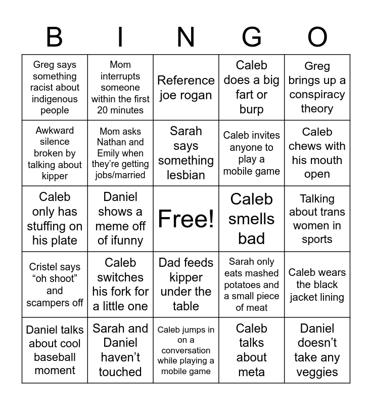 This bingo card has a free space and 24 words: Caleb switches his fork for a little one, Sarah and Daniel haven’t touched, Sarah says something lesbian, Daniel talks about cool baseball moment, Greg brings up a conspiracy theory, Greg says something racist about indigenous people, Awkward silence broken by talking about kipper, Mom interrupts someone within the first 20 minutes, Caleb smells bad, Dad feeds kipper under the table, Caleb invites anyone to play a mobile game, Caleb only has stuffing on his plate, Sarah only eats mashed potatoes and a small piece of meat, Caleb wears the black jacket lining, Mom asks Nathan and Emily when they’re getting jobs/married, Caleb talks about meta, Talking about trans women in sports, Reference joe rogan, Caleb chews with his mouth open, Daniel shows a meme off of ifunny, Daniel doesn’t take any veggies, Cristel says “oh shoot” and scampers off, Caleb does a big fart or burp and Caleb jumps in on a conversation while playing a mobile game.