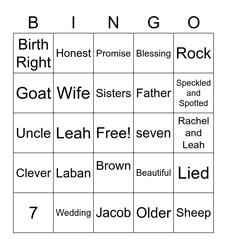This bingo card has a free space and 31 words: Jacob, Rachel, Leah, Heavy Veil, Birth Right, Promise, Wife, Beautiful, seven, Older, Rachel and Leah, Sheep, 7+7=14, Trick, Speckled and Spotted, Older, Lied, Laban, Clever, Brown, Rock, Hugged and kissed, 7, Honest, Father, Goat, Blessing, Uncle, Wedding, Sisters and Well.
