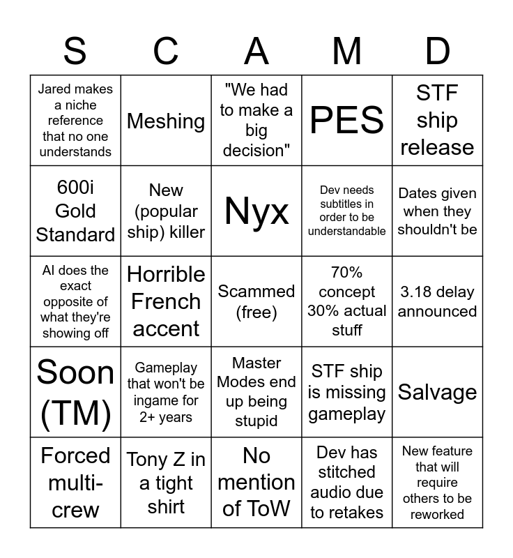 This bingo card has a free space and 29 words: Forced multi-crew, Blaming the community, Horrible French accent, "The way game development works", Jared makes a niche reference that no one understands, "We had to make a big decision", New (popular ship) killer, Gameplay that won't be ingame for 2+ years, 70% concept 30% actual stuff, Tony Z in a tight shirt, 3.18 delay announced, New feature that will require others to be reworked, No mention of ToW, Dev has stitched audio due to retakes, Dates given when they shouldn't be, Ruin Station is basically just a rest stop, Master Modes end up being stupid, Soon (TM), STF ship release, AI does the exact opposite of what they're showing off, STF ship is missing gameplay, Anything T0, Dev needs subtitles in order to be understandable, 600i Gold Standard, PES, Meshing, Salvage, Nyx and Pyro release schedule.