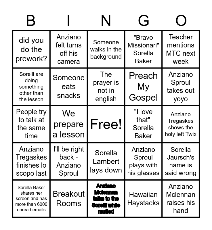 This bingo card has a free space and 28 words: Sorella Jaursch's name is said wrong, "Quindi" Sorella Baker, Preach My Gospel, Hawaiian Haystacks, Sorelli are doing something other than the lesson, Someone walks in the background, Anziano felt turns off his camera, Anziano Tregaskes finishes lo scopo last, "I love that" Sorella Baker, Sorella Baker shares her screen and has more than 6000 unread emails, People try to talk at the same time, "Bravo Missionari" Sorella Baker, Breakout Rooms, Anziano Mclennan talks to the Sorelli while mutied, Anziano Sproul takes out yoyo, Piggyback off of another comment, I'll be right back - Anziano Sproul, Someone eats snacks, The prayer is not in english, Sorella Lambert lays down, did you do the prework?, People chit chat during break, Anziano Mclennan raises his hand, We prepare a lesson, Anziano Tregaskes shows the holy left Twix, Anziano Sproul plays with his glasses, Teacher mentions MTC next week and Someone does the Italian hand thing instead of a thumbs up.