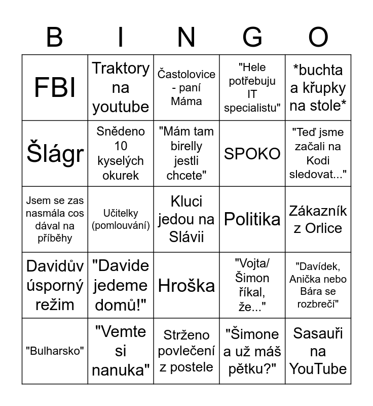 This bingo card has a free space and 24 words: "Davide jedeme domů!", "Vemte si nanuka", "Mám tam birelly jestli chcete", "Bulharsko", *buchta a křupky na stole*, FBI, Šlágr, Traktory na youtube, Politika, Hroška, SPOKO, Jsem se zas nasmála cos dával na příběhy, "Vojta/Šimon říkal, že...", "Davídek, Anička nebo Bára se rozbrečí", Snědeno 10 kyselých okurek, "Šimone a už máš pětku?", Zákazník z Orlice, Častolovice - paní Máma, "Teď jsme začali na Kodi sledovat...", Učitelky (pomlouvání), Sasauři na YouTube, Davidův úsporný režim, "Hele potřebuju IT specialistu" and Strženo povlečení z postele.