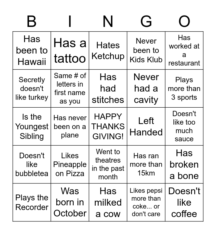 This bingo card has a free space and 24 words: Likes Pineapple on Pizza, Was born in October, Has had stitches, Plays the Recorder, Has worked at a restaurant, Has been to Hawaii, Secretly doesn't like turkey, Has a tattoo, Left Handed, Went to theatres in the past month, Never had a cavity, Is the Youngest Sibling, Has ran more than 15km, Has broken a bone, Same # of letters in first name as you, Likes pepsi more than coke... or don't care, Doesn't like too much sauce, Hates Ketchup, Plays more than 3 sports, Has never been on a plane, Doesn't like coffee, Doesn't like bubbletea, Never been to Kids Klub and Has milked a cow.