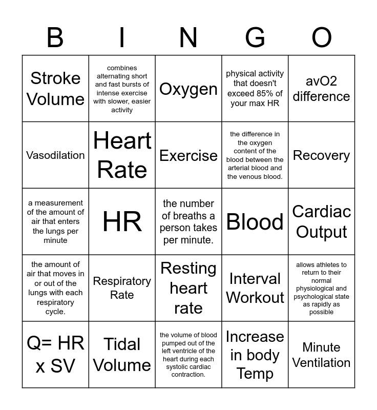 This bingo card has a free space and 29 words: Q= HR x SV, The number of times the heart beats within a minute., HR, SV, Stroke Volume, Oxygen, Heart Rate, Respiratory Rate, Blood, Tidal Volume, Cardiac Output, Minute Ventilation, the volume of blood pumped out of the left ventricle of the heart during each systolic cardiac contraction., Increase in body Temp, Recovery, Vasoconstriction, Resting heart rate, the amount of air that moves in or out of the lungs with each respiratory cycle., avO2 difference, a measurement of the amount of air that enters the lungs per minute, Interval Workout, Sub-maximal Activity, the difference in the oxygen content of the blood between the arterial blood and the venous blood., Vasodilation, physical activity that doesn't exceed 85% of your max HR, combines alternating short and fast bursts of intense exercise with slower, easier activity, allows athletes to return to their normal physiological and psychological state as rapidly as possible, Exercise and Product of TV and RR.