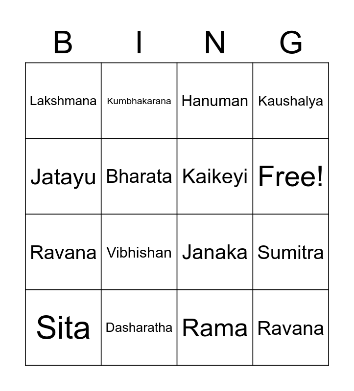 This bingo card has 17 words: Rama, Sita, Hanuman, Lakshmana, Vibhishan, Kaushalya, Sumitra, Kaikeyi, Free!, Bharata, Dasharatha, Janaka, Jatayu, Kumbhakarana, Ravana, Vashishta and Ravana.