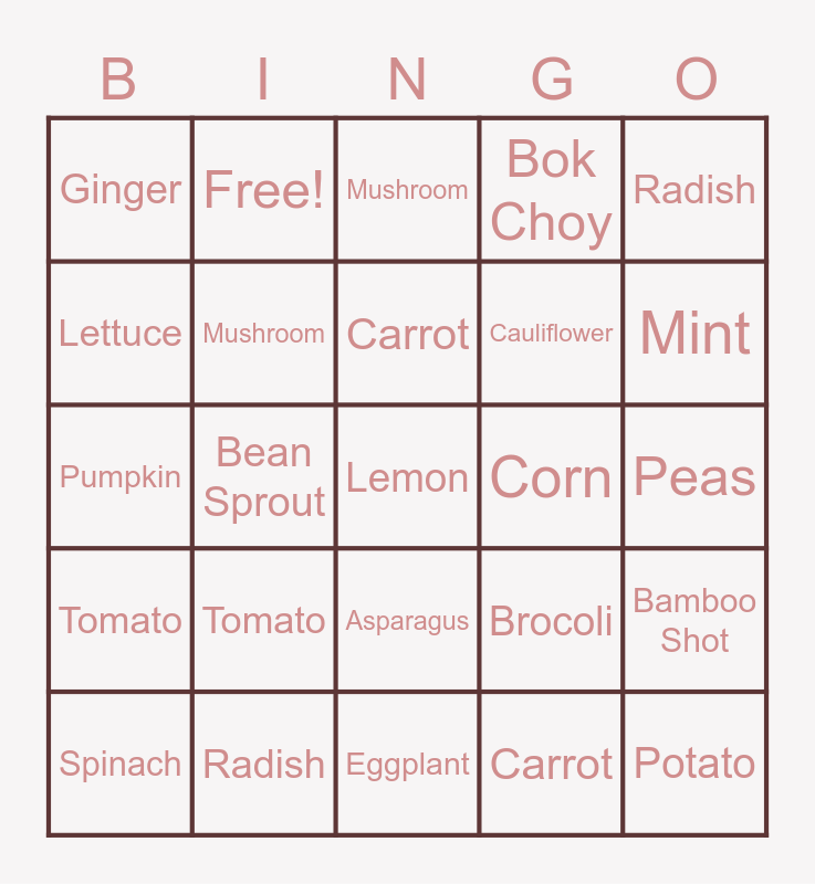 This bingo card has 34 words: Potato, Carrot, Brocoli, Corn, Tomato, Mushroom, Radish, Spinach, Free!, Potato, Carrot, Mushroom, Spinach, Spring Onion, Corn, Mint, Radish, Pumpkin, Tomato, Brocoli, Asparagus, Cabbage, Ginger, Peas, Eggplant, Lemon, Bok Choy, Long Bean, Cauliflower, Lettuce, Cucumber, Bean Sprout, Bamboo Shot and Chilli.
