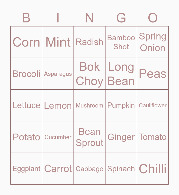 This bingo card has 25 words: Potato, Carrot, Mushroom, Spinach, Spring Onion, Corn, Mint, Radish, Pumpkin, Tomato, Brocoli, Asparagus, Cabbage, Ginger, Peas, Eggplant, Lemon, Bok Choy, Long Bean, Cauliflower, Lettuce, Cucumber, Bean Sprout, Bamboo Shot and Chilli.