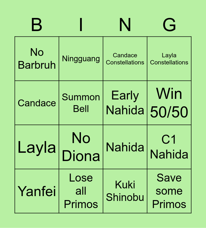 This bingo card has 16 words: Lose all Primos, C1 Nahida, Candace Constellations, No Barbruh, Layla, Ningguang, Nahida, Kuki Shinobu, Candace, Summon Bell, Yanfei, Layla Constellations, No Diona, Win 50/50, Early Nahida and Save some Primos.