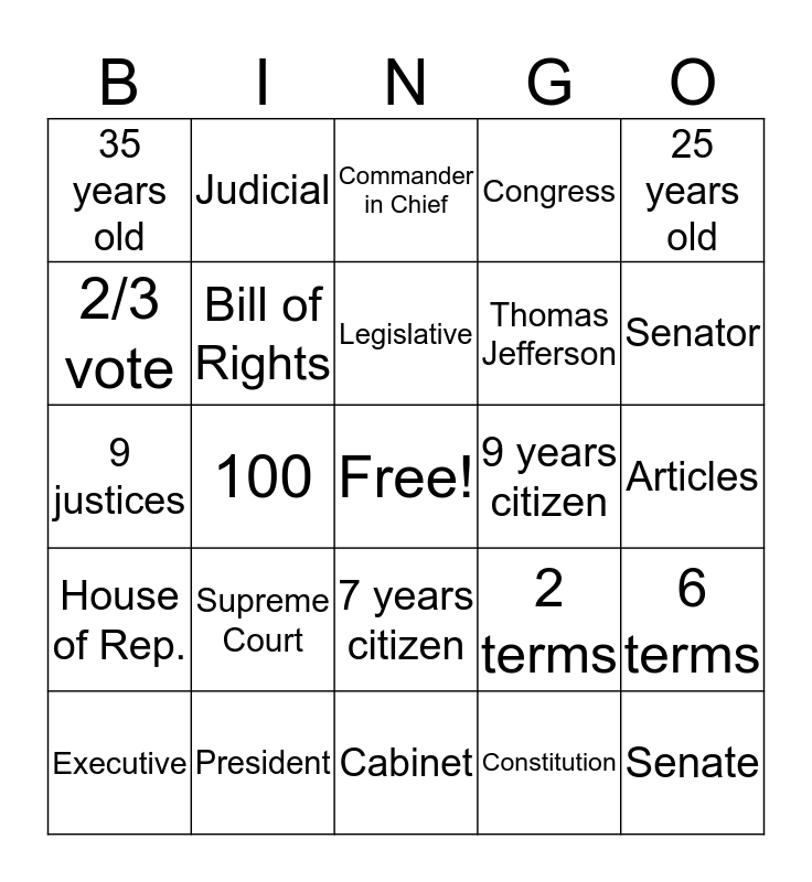 This bingo card has a free space and 24 words: Supreme Court, President, Legislative, Executive, 25 years old, 35 years old, 2/3 vote, Judicial, 9 years citizen, 7 years citizen, Thomas Jefferson, 9 justices, 2 terms, 6 terms, Bill of Rights, Constitution, Articles, Commander in Chief, Senator, 100, Senate, House of Rep., Congress and Cabinet.