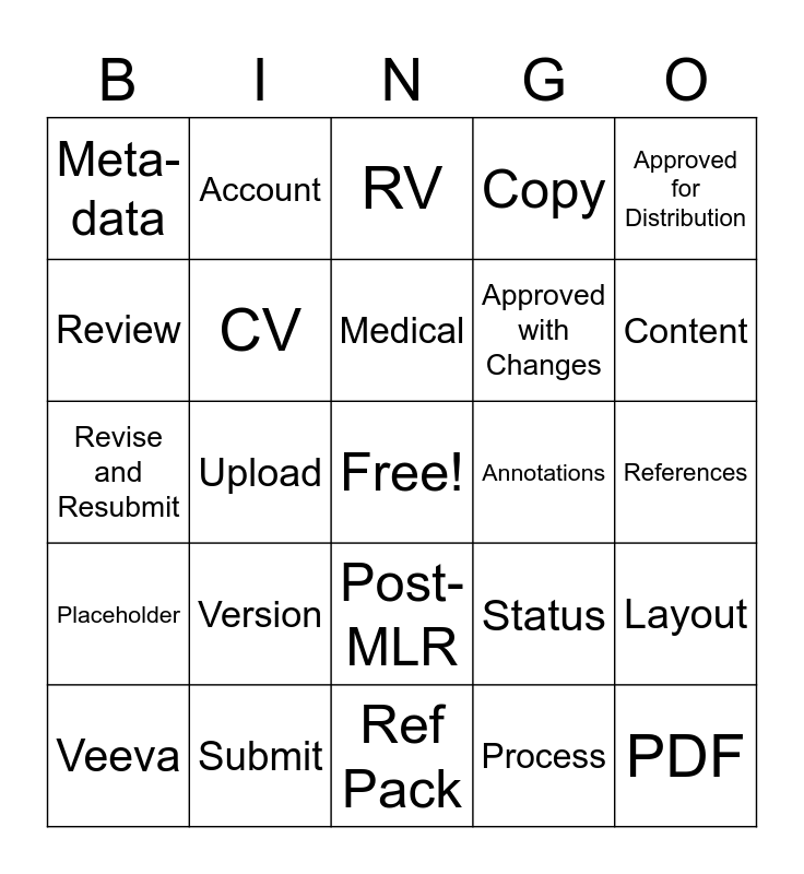 This bingo card has a free space and 29 words: Veeva, MLR, Upload, Comment, Meta-data, RV, CV, Version, Annotations, Submit, References, PDF, Ref Pack, Process, Content, Margins, Post-MLR, Placeholder, Approved for Distribution, Revise and Resubmit, Status, Resolve, Approved with Changes, Review, Copy, Account, Layout, Medical and Legal.
