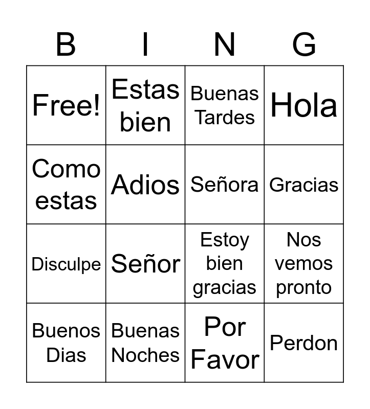 This bingo card has 16 words: Buenos Dias, Buenas Noches, Buenas Tardes, Hola, Como estas, Estas bien, Estoy bien gracias, Nos vemos pronto, Free!, Adios, Por Favor, Gracias, Disculpe, Señor, Señora and Perdon.
