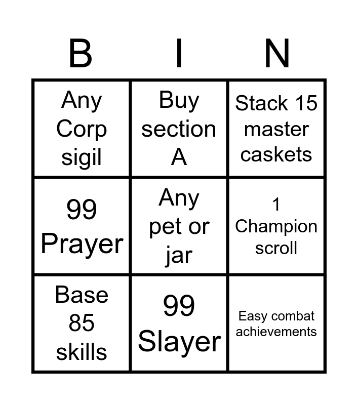 This bingo card has a free space and 8 words: 1 Champion scroll, Stack 15 master caskets, Buy section A, Base 85 skills, Any Corp sigil, Easy combat achievements, 99 Prayer and 99 Slayer.