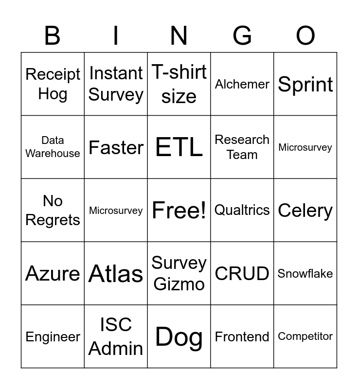 This bingo card has a free space and 44 words: Agile, Competitor, Roadmap, Engineer, Backend, Frontend, T-shirt size, Revenue, Sprint, ISC Admin, Alchemer, Qualtrics, Survey Gizmo, Atlas, Cat, Dog, Numerator, No Regrets, Taxonomy, Microsurvey, Instant Survey, Custom Survey, Syndicated Survey, Receipt Hog, JIRA, Celery, DAG, Kubernetes, CRUD, Azure, Lamda, Snowflake, Insights, Tableau, Microsurvey, Coins, Specs, Consumer Apps, ETL, Data Warehouse, Research Team, Scientist, Faster and Real-time.