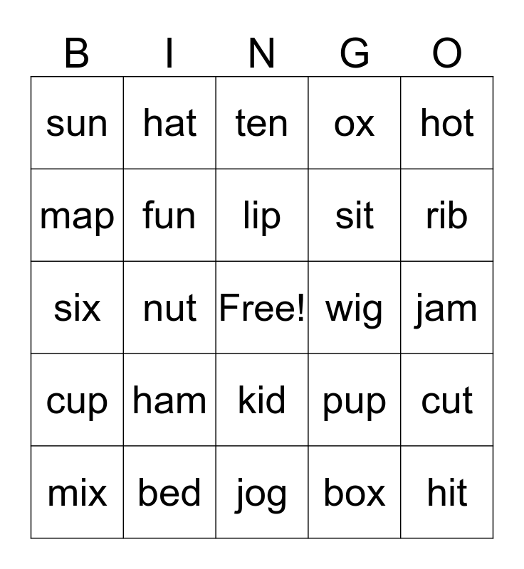 This bingo card has a free space and 24 words: ham, bed, lip, mix, hot, sun, map, hat, wig, kid, sit, six, pup, cut, fun, box, jam, ten, rib, nut, hit, cup, ox and jog.