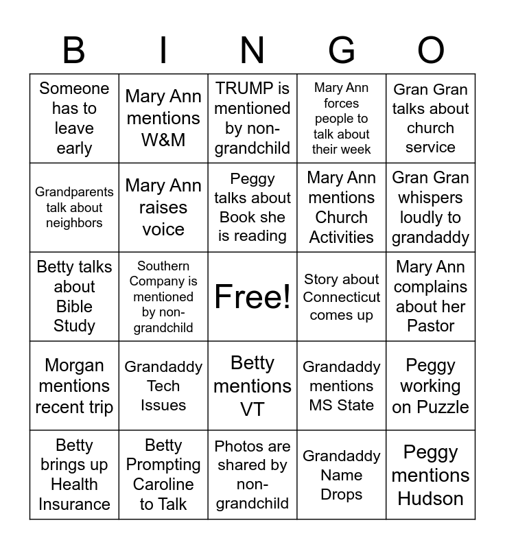 This bingo card has a free space and 24 words: Grandaddy Tech Issues, Betty Prompting Caroline to Talk, Peggy talks about Book she is reading, Betty brings up Health Insurance, Gran Gran talks about church service, Someone has to leave early, Grandparents talk about neighbors, Mary Ann mentions W&M, Story about Connecticut comes up, Betty mentions VT, Mary Ann mentions Church Activities, Betty talks about Bible Study, Grandaddy mentions MS State, Peggy working on Puzzle, Mary Ann raises voice, Grandaddy Name Drops, Mary Ann complains about her Pastor, TRUMP is mentioned by non-grandchild, Gran Gran whispers loudly to grandaddy, Southern Company is mentioned by non-grandchild, Peggy mentions Hudson, Morgan mentions recent trip, Mary Ann forces people to talk about their week and Photos are shared by non-grandchild.