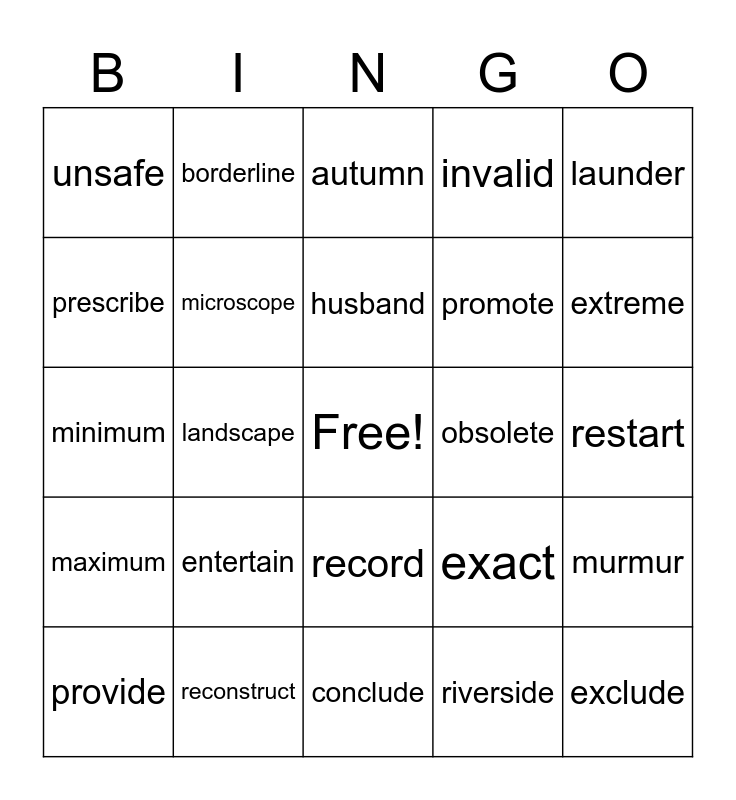 This bingo card has a free space and 32 words: riverside, costume, landscape, stampede, maximum, microscope, launder, murmur, borderline, tornado, husband, autumn, backbone, handshake, obsolete, misbehave, provide, minimum, record, entertain, exact, combine, restart, reconstruct, exclude, invalid, promote, prescribe, unsafe, conclude, umpire and extreme.