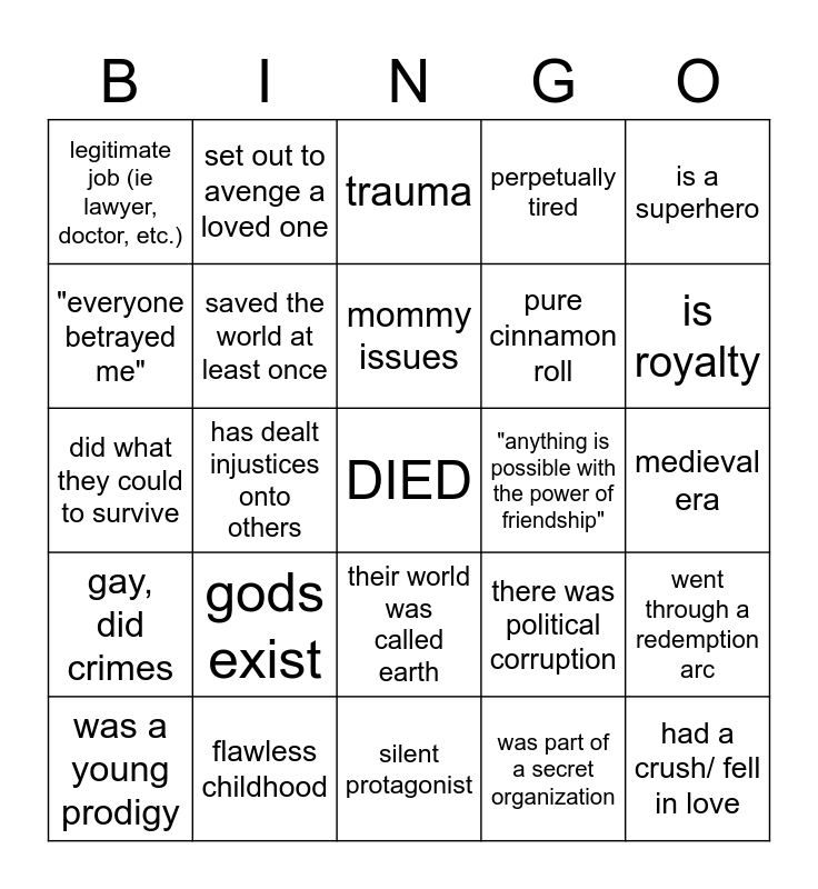 This bingo card has a free space and 24 words: gods exist, flawless childhood, mommy issues, was a young prodigy, is a superhero, legitimate job (ie lawyer, doctor, etc.), "everyone betrayed me", set out to avenge a loved one, "anything is possible with the power of friendship", their world was called earth, pure cinnamon roll, did what they could to survive, there was political corruption, went through a redemption arc, saved the world at least once, was part of a secret organization, medieval era, trauma, is royalty, has dealt injustices onto others, had a crush/ fell in love, gay, did crimes, perpetually tired and silent protagonist.