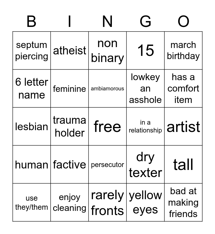 This bingo card has a free space and 24 words: factive, enjoy cleaning, ambiamorous, use they/them, march birthday, septum piercing, 6 letter name, atheist, in a relationship, persecutor, lowkey an asshole, lesbian, dry texter, tall, feminine, yellow eyes, artist, non binary, has a comfort item, trauma holder, bad at making friends, human, 15 and rarely fronts.