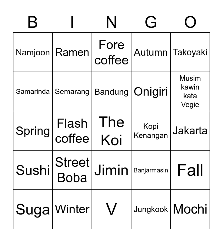 This bingo card has a free space and 24 words: Street Boba, Winter, Bandung, Suga, Takoyaki, Namjoon, Samarinda, Ramen, Kopi Kenangan, Jimin, Onigiri, Spring, Banjarmasin, Fall, Semarang, Jungkook, Jakarta, Fore coffee, Musim kawin kata Vegie, Flash coffee, Mochi, Sushi, Autumn and V.