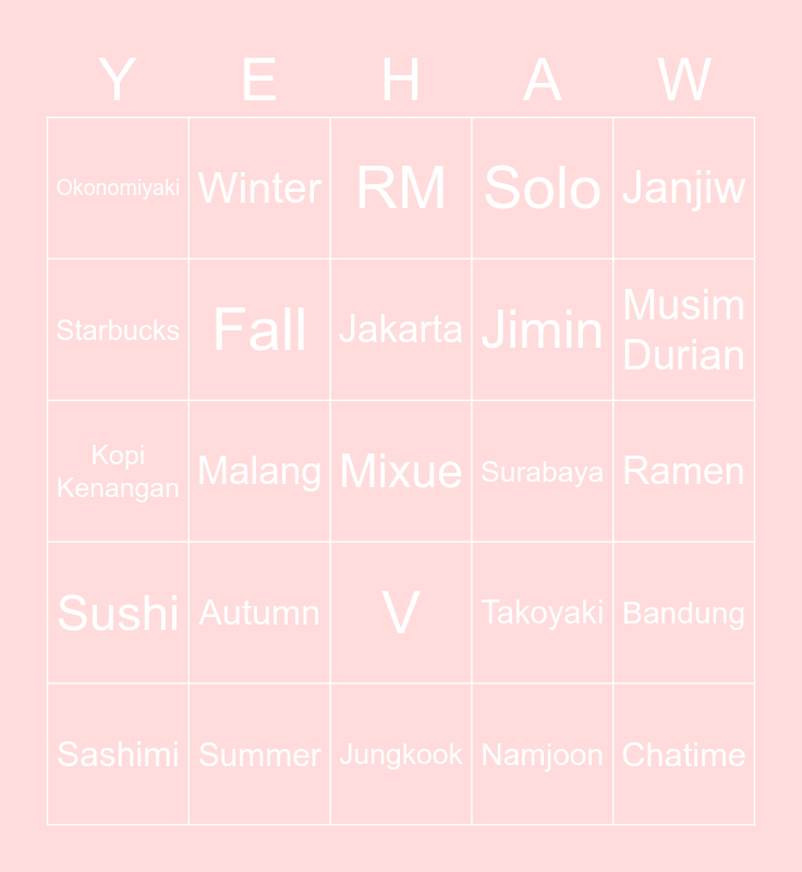 This bingo card has 25 words: Autumn, Jungkook, Jakarta, Sashimi, Janjiw, Okonomiyaki, Starbucks, Winter, Surabaya, V, Jimin, Kopi Kenangan, Takoyaki, Bandung, Fall, Chatime, Ramen, RM, Musim Durian, Malang, Mixue, Summer, Sushi, Solo and Namjoon.