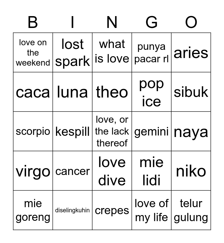This bingo card has a free space and 24 words: cancer, diselingkuhin, theo, mie goreng, aries, love on the weekend, caca, lost spark, gemini, love dive, pop ice, scorpio, mie lidi, niko, luna, love of my life, naya, what is love, sibuk, kespill, telur gulung, virgo, punya pacar rl and crepes.