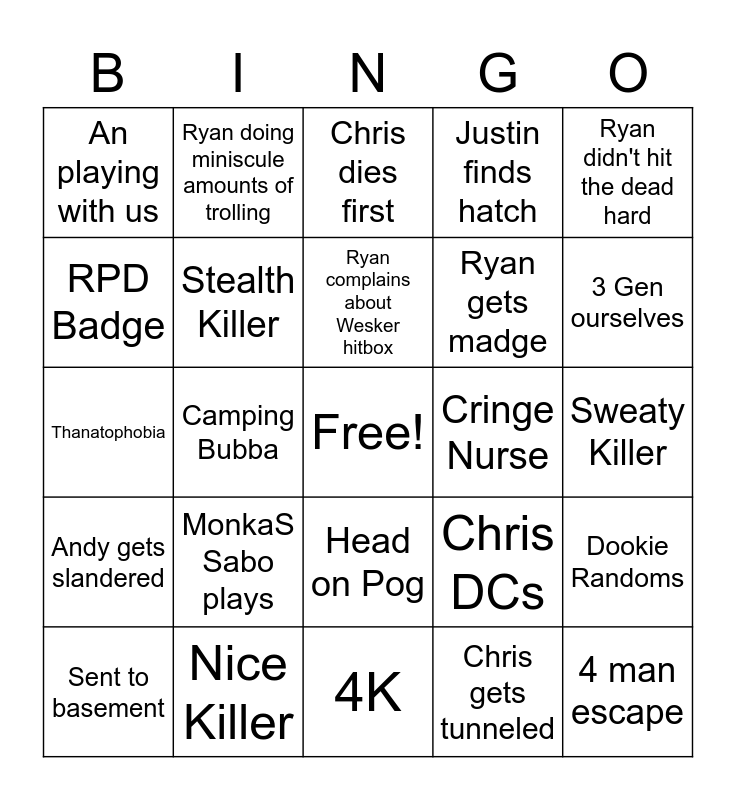 This bingo card has a free space and 24 words: MonkaS Sabo plays, Nice Killer, Ryan complains about Wesker hitbox, Sent to basement, Ryan didn't hit the dead hard, An playing with us, RPD Badge, Ryan doing miniscule amounts of trolling, Cringe Nurse, Head on Pog, Ryan gets madge, Thanatophobia, Chris DCs, Dookie Randoms, Stealth Killer, Chris gets tunneled, Sweaty Killer, Chris dies first, 3 Gen ourselves, Camping Bubba, 4 man escape, Andy gets slandered, Justin finds hatch and 4K.