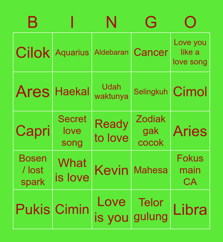 This bingo card has a free space and 24 words: What is love, Cimin, Udah waktunya, Pukis, Love you like a love song, Cilok, Ares, Aquarius, Zodiak gak cocok, Kevin, Selingkuh, Capri, Mahesa, Fokus main CA, Haekal, Telor gulung, Aries, Aldebaran, Cimol, Secret love song, Libra, Bosen / lost spark, Cancer and Love is you.