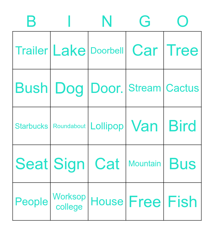 This bingo card has 30 words: Worksop college, Snow, Roundabout, Tractors, Trailer, Doorbell, Dog, Cat, Van, House, Bird, Lollipop, Free, Fish, Cactus, Light, Mountain, Seat, Sign, Tree, Starbucks, Apple, Lake, Stream, Bush, Car, Bus, People, Door. and train.