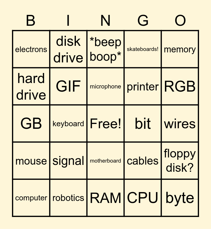 This bingo card has a free space and 29 words: computer, information, RAM, CPU, memory, hard drive, disk drive, program, bit, byte, GB, GIF, C:\, cables, wires, microchip, keyboard, motherboard, skateboards!, floppy disk?, mouse, robotics, microphone, printer, RGB, electrons, signal, *beep boop* and (rhyming).