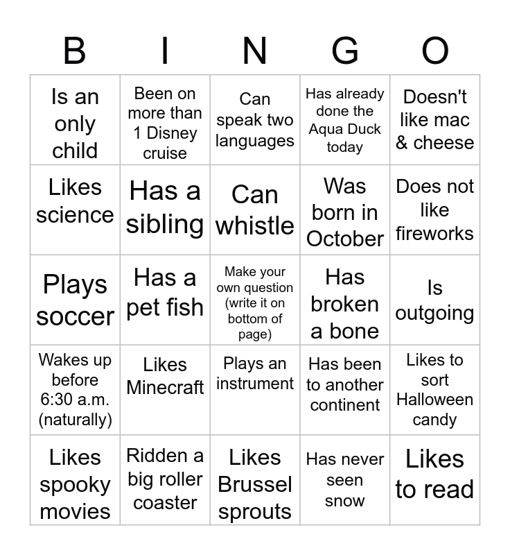 This bingo card has a free space and 24 words: Likes Minecraft, Ridden a big roller coaster, Can whistle, Likes spooky movies, Doesn't like mac & cheese, Is an only child, Likes science, Been on more than 1 Disney cruise, Has broken a bone, Plays an instrument, Was born in October, Plays soccer, Has been to another continent, Likes to sort Halloween candy, Has a sibling, Has never seen snow, Is outgoing, Can speak two languages, Does not like fireworks, Has a pet fish, Likes to read, Wakes up before 6:30 a.m. (naturally), Has already done the Aqua Duck today and Likes Brussel sprouts.